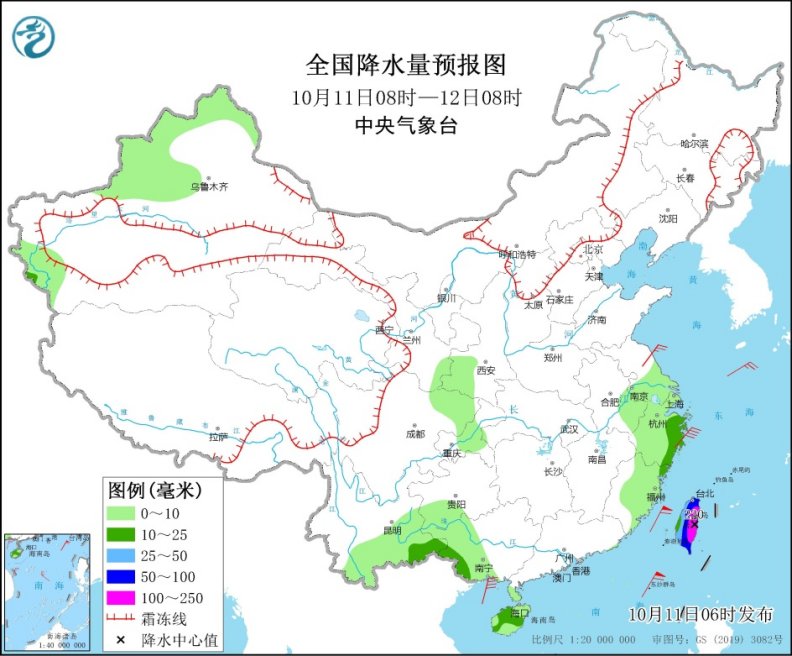 全國降水量預報圖(10月11日08時-12日08時)
