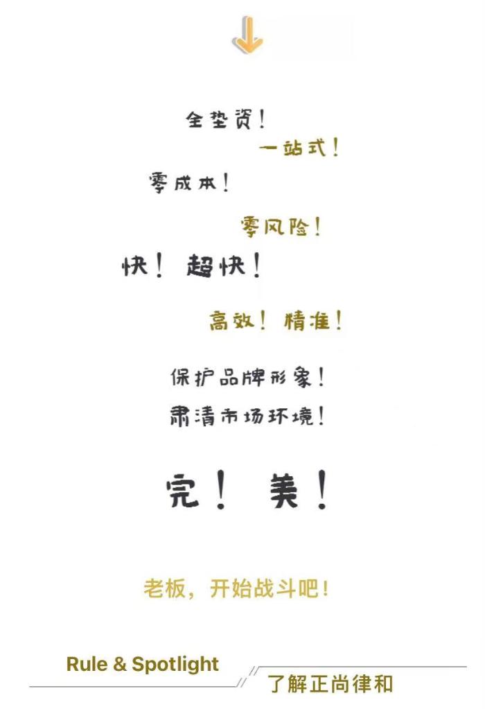 正尚律和的微信公號“正尚律和知識產(chǎn)權(quán)”中有一篇《正尚律和是怎么幫企業(yè)打假的?》文章,道出了正尚律和的運(yùn)作模式:文章宣稱委托方不用花一分錢,也不用出一個(gè)人!罢新珊腿珖46個(gè)城市、32家律所的調(diào)查團(tuán)隊(duì)、專業(yè)律師就都是你的人”,文章還稱2000+員工全國范圍內(nèi)地毯式排查,用時(shí)15到45天,《全國侵權(quán)報(bào)告》出爐,“你說打誰我們就打誰”,用時(shí)30天左右“民事訴訟or協(xié)商解決or行政查處or刑事追究,你說了算”。文章還稱,整個(gè)過程全墊資,委托方零成本。