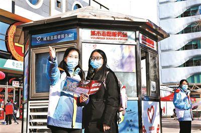 藺紅霞(左)在西單圖書大廈城市志愿者服務(wù)站點為市民指路
