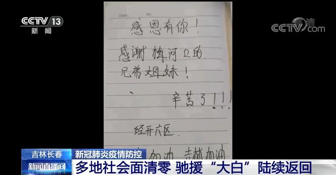 4月12日下午,長(zhǎng)春新區(qū)、經(jīng)濟(jì)技術(shù)開發(fā)區(qū),凈月高新技術(shù)產(chǎn)業(yè)開發(fā)區(qū)、二道區(qū)基本實(shí)現(xiàn)社會(huì)面動(dòng)態(tài)清零。在經(jīng)濟(jì)技術(shù)開發(fā)區(qū)的封控區(qū)中央公園小區(qū),完成包保援助任務(wù)的梅河口市志愿者們與居民道別。此次,梅河口市共派出了5000名志愿者援助長(zhǎng)春,他們的付出得到了居民們的認(rèn)可,不能面對(duì)面交流,大家就在房門上留下各種感謝的字條。