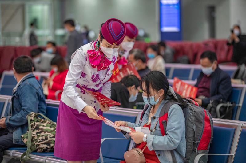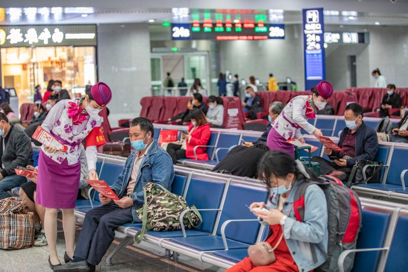 4月14日,在重慶北站候車大廳,中國鐵路成都局集團(tuán)有限公司重慶客運(yùn)段青年職工志愿者為旅客發(fā)放國家安全日宣傳單。