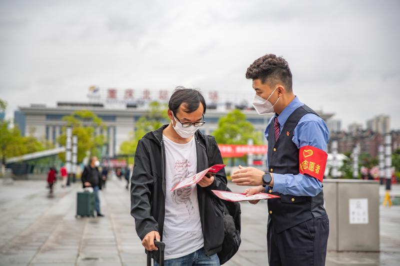 4月14日,在重慶北站北廣場,中國鐵路成都局集團(tuán)有限公司重慶客運(yùn)段青年職工志愿者為旅客宣講防范化解危害國家安全行為的小知識。