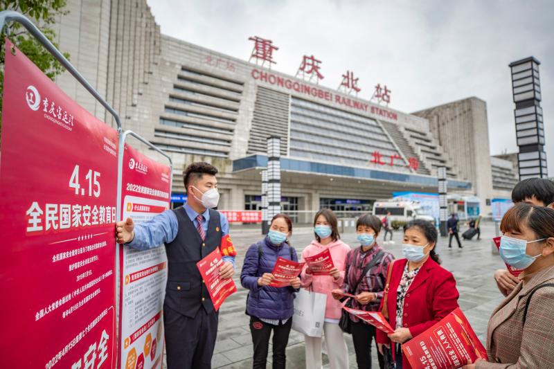 4月14日,在重慶北站北廣場,中國鐵路成都局集團(tuán)有限公司重慶客運(yùn)段青年職工志愿者向旅客發(fā)放國家安全日宣傳單。