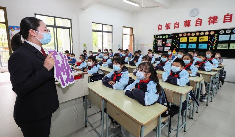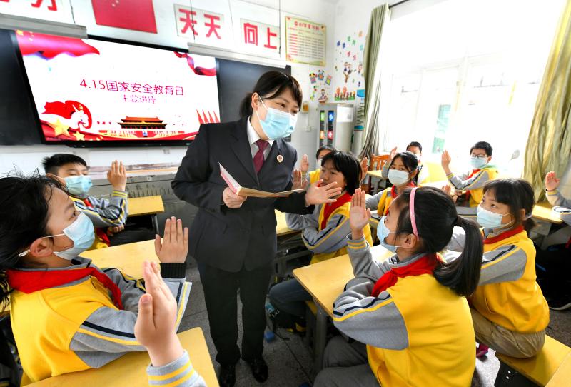 4月14日,在河南省焦作市溫縣第三實(shí)驗(yàn)小學(xué),法官為學(xué)生進(jìn)行國家安全教育。