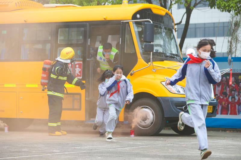 4月14日,在浙江省湖州市德清縣雷甸鎮(zhèn)中心小學(xué)通航校區(qū),學(xué)生們在消防隊(duì)員指導(dǎo)下進(jìn)行校車應(yīng)急逃生演練。