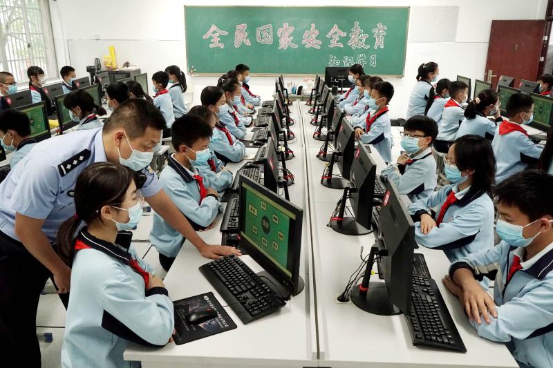 4月14日,公安民警在浙江省金華市武義縣三角店小學(xué)多媒體機(jī)房指導(dǎo)學(xué)生進(jìn)行國家安全教育答題。