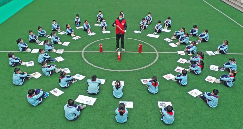 4月14日,浙江省臺州市仙居縣第一小學(xué)的學(xué)生學(xué)習(xí)消防安全相關(guān)知識(無人機(jī)照片)。