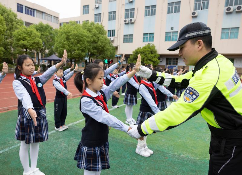 4月14日,浙江省諸暨市公安局的民警在浣紗小學(xué)指導(dǎo)學(xué)生學(xué)習(xí)交通指揮手勢。