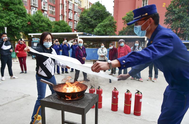 4月14日,在河南省洛陽市澗西區(qū)武漢路街道武漢路社區(qū),居民在澗西區(qū)消防大隊(duì)消防員的指導(dǎo)下練習(xí)使用滅火毯。