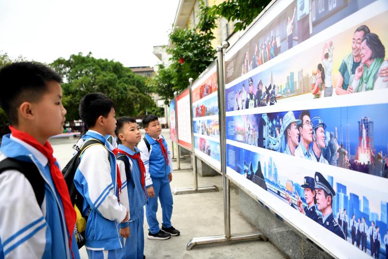 4月14日,貴州省榕江縣車民小學(xué)學(xué)生在觀看國家安全教育主題展板。