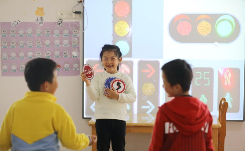 4月14日,在安徽省合肥市蜀山區(qū)琥珀街道北苑村社區(qū)轄區(qū)幼兒園,小朋友通過互動游戲的方式,學(xué)習(xí)了解交通安全知識。