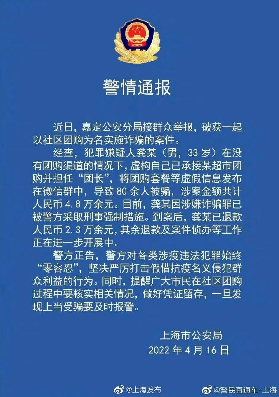 上海市公安局通報(bào),近日,嘉定公安分局接群眾舉報(bào),破獲一起以社區(qū)團(tuán)購(gòu)為名實(shí)施詐騙的案件。經(jīng)查,犯罪嫌疑人龔某(男,33歲)在沒(méi)有團(tuán)購(gòu)渠道的情況下,虛構(gòu)自己已承接某超市團(tuán)購(gòu)并擔(dān)任“團(tuán)長(zhǎng)”,將團(tuán)購(gòu)套餐等虛假信息發(fā)布在微信群中,導(dǎo)致80余人被騙,涉案金額共計(jì)人民幣4.8萬(wàn)余元。目前,龔某因涉嫌詐騙罪已被警方采取刑事強(qiáng)制措施。到案后,龔某已退款人民幣2.3萬(wàn)余元,其余退款及案件偵辦等工作正在進(jìn)一步開(kāi)展中。
