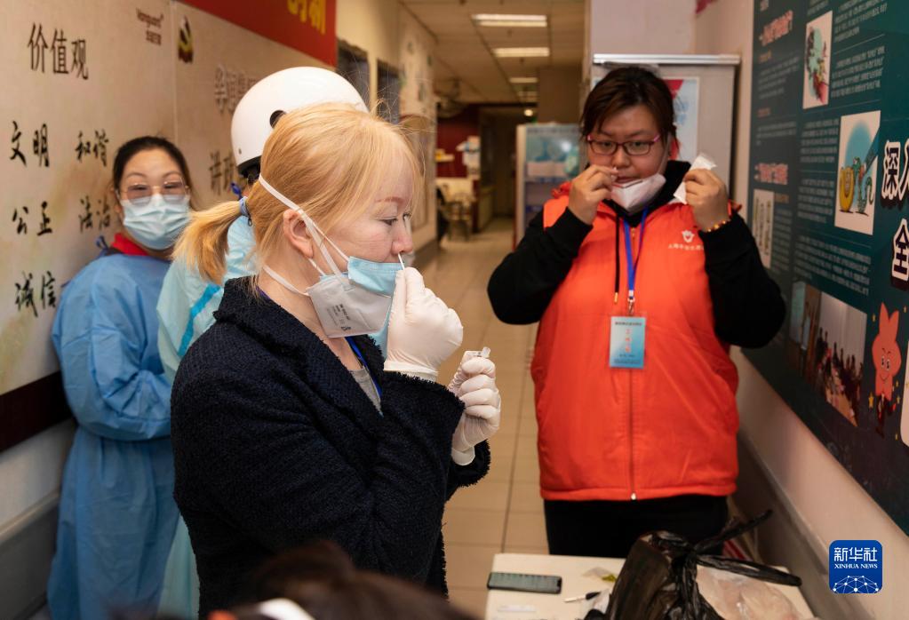 4月17日,進入超市之前,許雯靜(右后)和俞靜芳按要求進行抗原檢測。