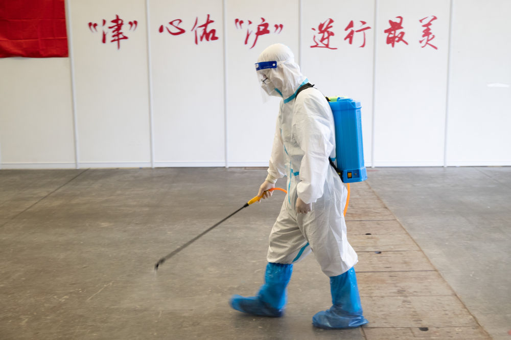 4月14日,工作人員在方艙醫(yī)院指揮部清潔區(qū)消殺。 新華社記者 金立旺 攝