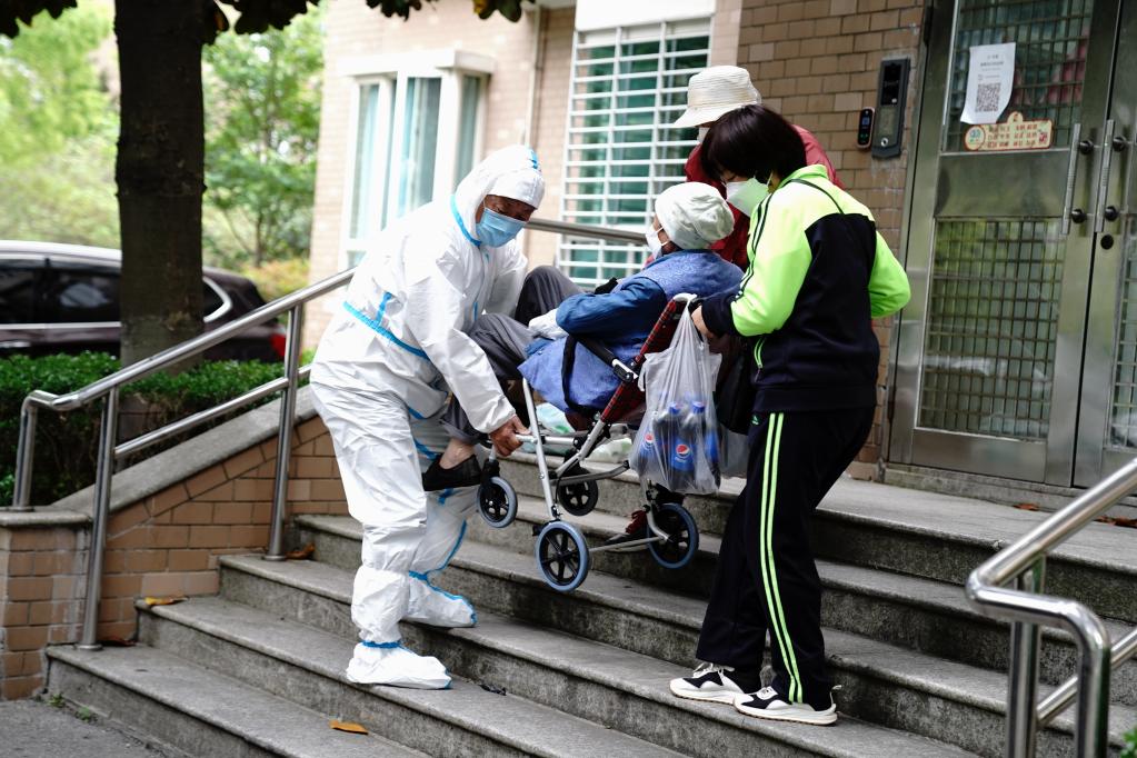 古美社區(qū)衛(wèi)生服務(wù)中心司機(jī)馮守光協(xié)助家屬把血透患者抬下臺(tái)階。新華社記者 張建松 攝