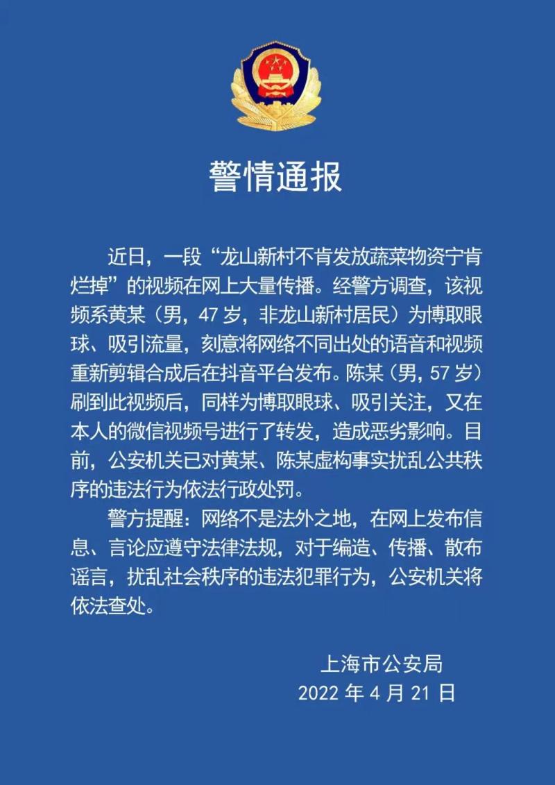 近日,一段“龍山新村不肯發(fā)放蔬菜物資寧肯爛掉”的視頻在網(wǎng)上大量傳播。經(jīng)警方調(diào)查,該視頻系黃某(男,47歲,非龍山新村居民)為博取眼球、吸引流量,刻意將網(wǎng)絡(luò)不同出處的語音和視頻重新剪輯合成后在抖音平臺(tái)發(fā)布。陳某(男,57歲)刷到此視頻后,同樣為博取眼球、吸引關(guān)注,又在本人的微信視頻號進(jìn)行了轉(zhuǎn)發(fā),造成惡劣影響。目前,公安機(jī)關(guān)已對黃某、陳某虛構(gòu)事實(shí)擾亂公共秩序的違法行為依法行政處罰。