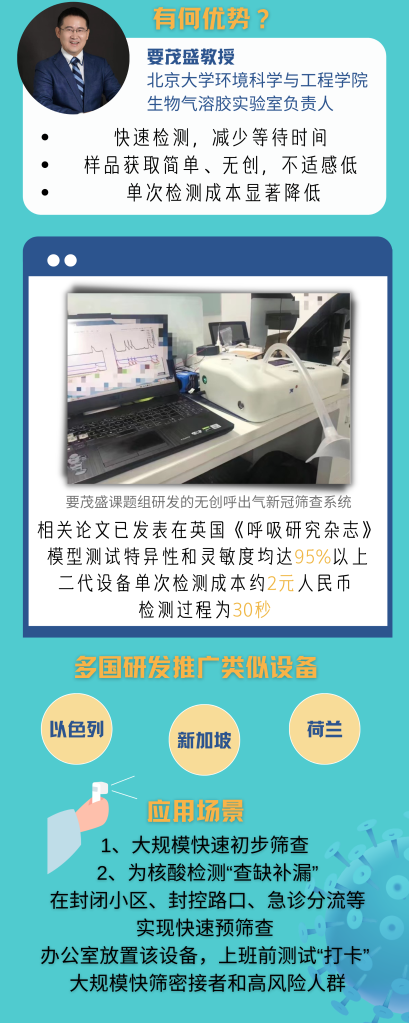 北京大學(xué)環(huán)境科學(xué)與工程學(xué)院生物氣溶膠實(shí)驗(yàn)室負(fù)責(zé)人要茂盛教授說,與現(xiàn)有的PCR核酸、抗原檢測相比,新冠呼氣檢測可快速檢測到早期感染、無癥狀感染等,減少等待時(shí)間;樣品的獲取簡單、無創(chuàng),大幅降低之前采集鼻咽拭子的不適感;單次檢測成本也顯著降低。