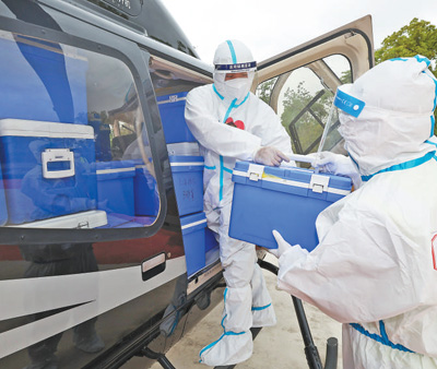 24日,機務(wù)人員將核酸檢測樣本搬運到直升機上。