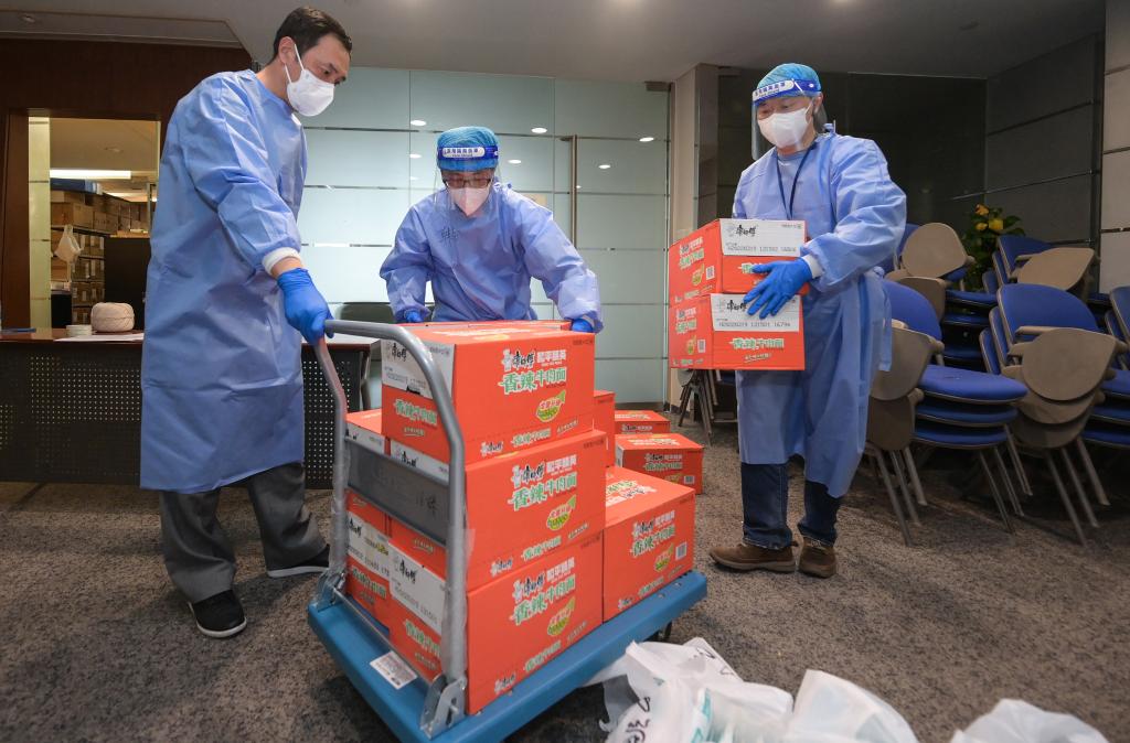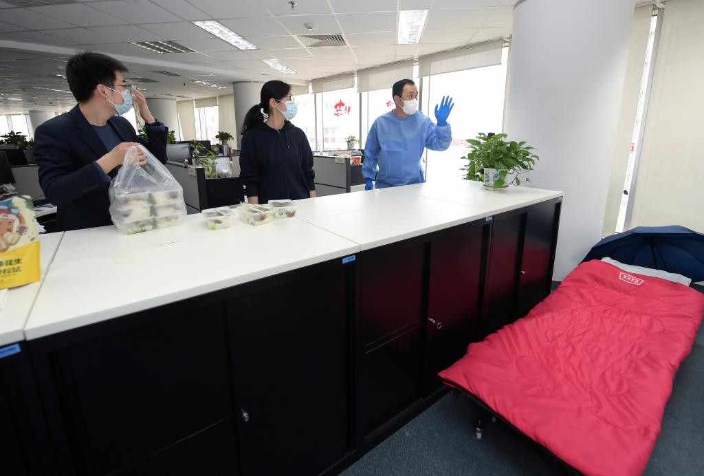 ↑中國銀行上海市分行后勤服務(wù)中心副總經(jīng)理王梁輝(左)、主管韓皓(中)和員工薛鋒為閉環(huán)管理辦公地準(zhǔn)備物資。