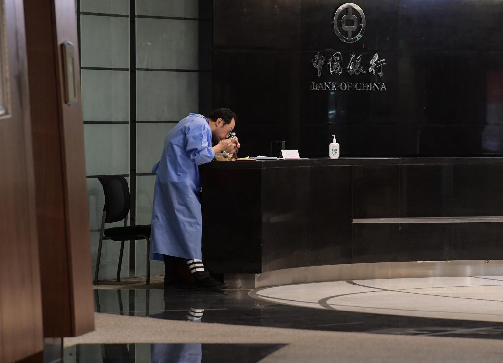↑中午用餐時(shí)間,在后勤保障小組的安排下,值守在中銀大廈的各部門職員相繼來到食堂領(lǐng)取本部門的餐食。