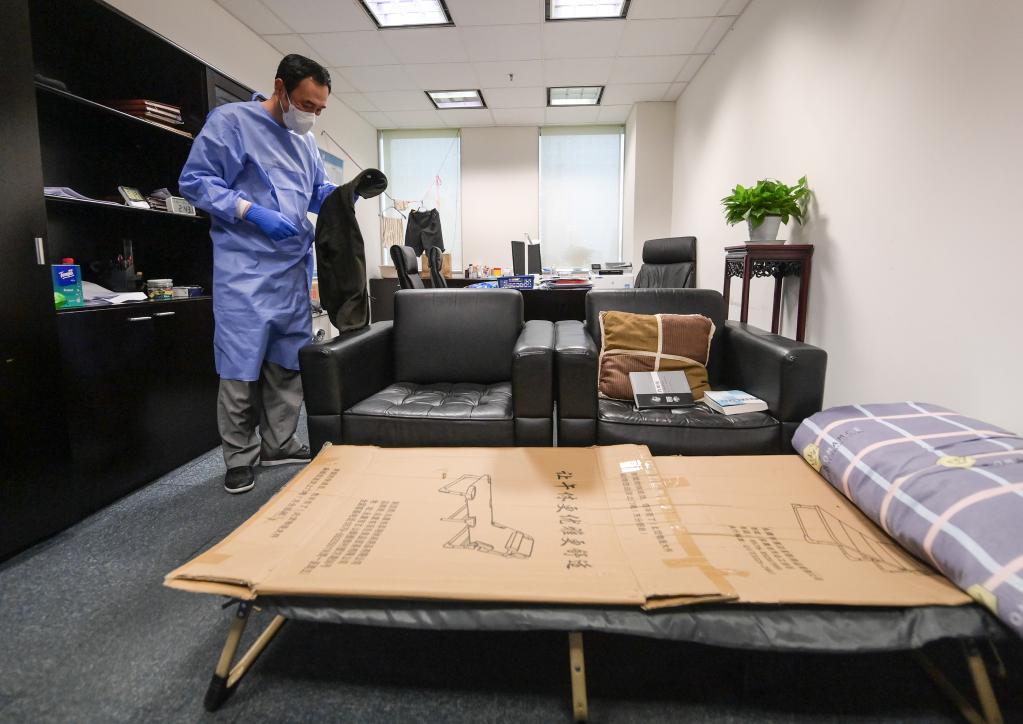 ↑在中國銀行上海市分行后勤服務(wù)中心辦公室內(nèi),53歲的王梁輝在自己的折疊床上鋪墊硬紙板緩解長時(shí)間使用帶來的不適,同時(shí)解決了床鋪稍短的問題。