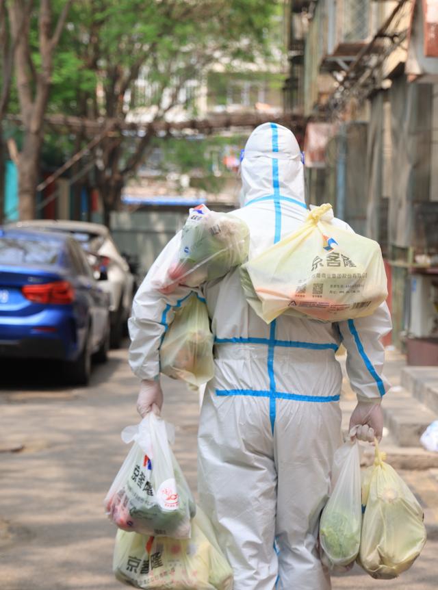 身穿防護服的“大白”,手里拎著、腋下夾著七八袋蔬菜,送給封控居民。他的背影被攝影師定格下來,感動了很多人。
