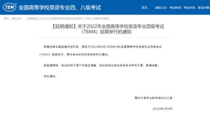 【延期通知】關(guān)于2022年全國高等學校英語專業(yè)四級考試(TEM4)延期舉行的通知