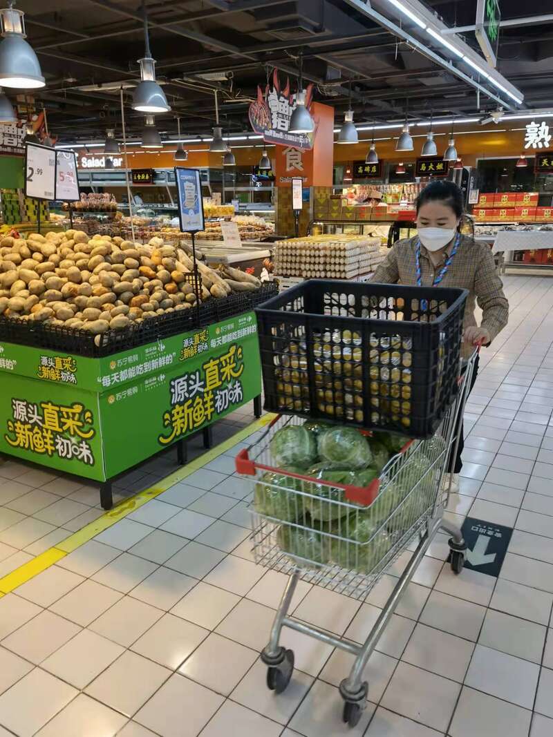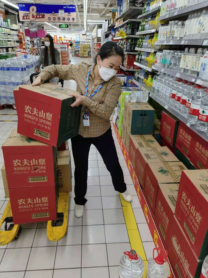 杜娟還記得,4月24號晚,收到管控消息,周圍的小區(qū)居民開始有些恐慌,當(dāng)晚的客流量達(dá)到了平常的五六倍,正常營業(yè)時間從晚上九點半推遲了一小時,賣場比過年還“熱鬧”。她緊急和采購部溝通,將配貨量提至5倍。