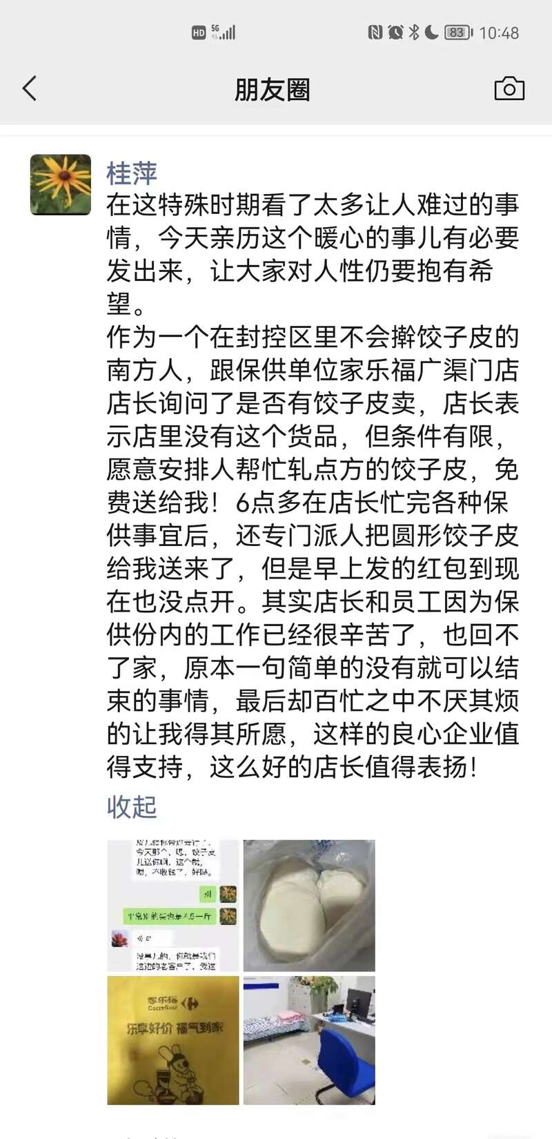 需要餃子皮的封控居民發(fā)朋友圈,給杜娟點贊。(受訪者供圖)