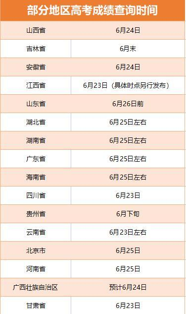 其中,江西、甘肅等省份的查分時間都在6月23日,安徽、山西等地為6月24日,北京、河南等地為6月25日。