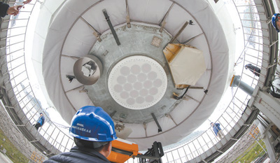技術(shù)人員對“中國天眼”的饋源艙進行維護保養(yǎng)。新華社記者 歐東衢攝