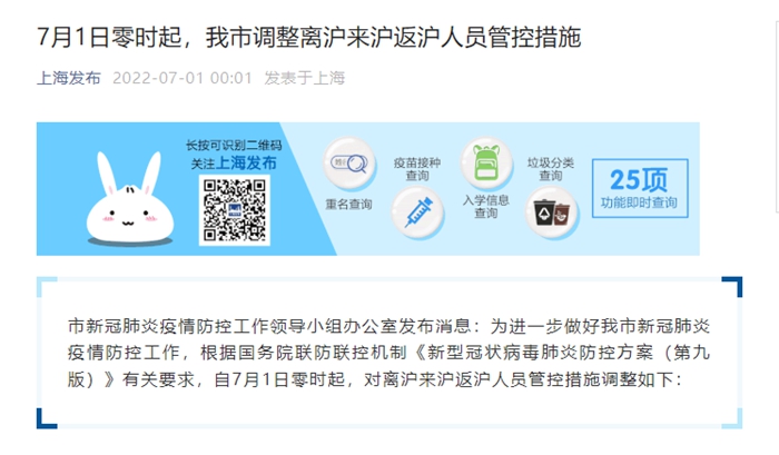 市新冠肺炎疫情防控工作領(lǐng)導(dǎo)小組辦公室發(fā)布消息:為進(jìn)一步做好我市新冠肺炎疫情防控工作,根據(jù)國(guó)務(wù)院聯(lián)防聯(lián)控機(jī)制《新型冠狀病毒肺炎防控方案(第九版)》有關(guān)要求,自7月1日零時(shí)起,對(duì)離滬來滬返滬人員管控措施調(diào)整如下: