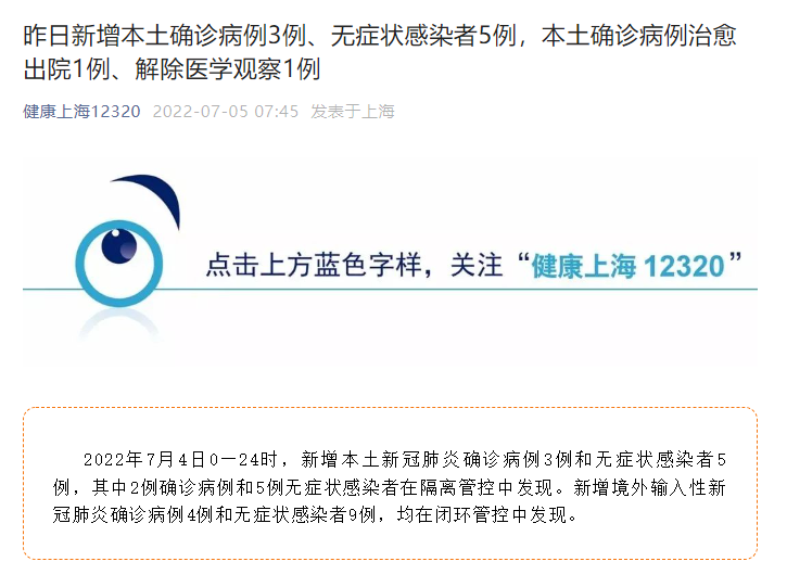 2022年7月4日0—24時,上海新增本土新冠肺炎確診病例3例和無癥狀感染者5例,其中2例確診病例和5例無癥狀感染者在隔離管控中發(fā)現(xiàn)。新增境外輸入性新冠肺炎確診病例4例和無癥狀感染者9例,均在閉環(huán)管控中發(fā)現(xiàn)。