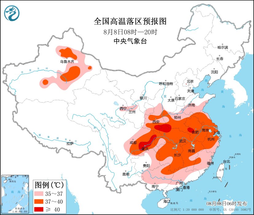 預(yù)計8月8日白天,四川東部、重慶、陜西中南部、山東中南部、河南、安徽、江蘇、上海、湖北、貴州東部、湖南、江西、浙江、福建、廣西中北部、廣東中北部及新疆南疆盆地東部和北疆南部等地有35~39℃高溫天氣,其中,陜西東南部、湖北西北部、重慶中西部等地局地可達40℃或以上。