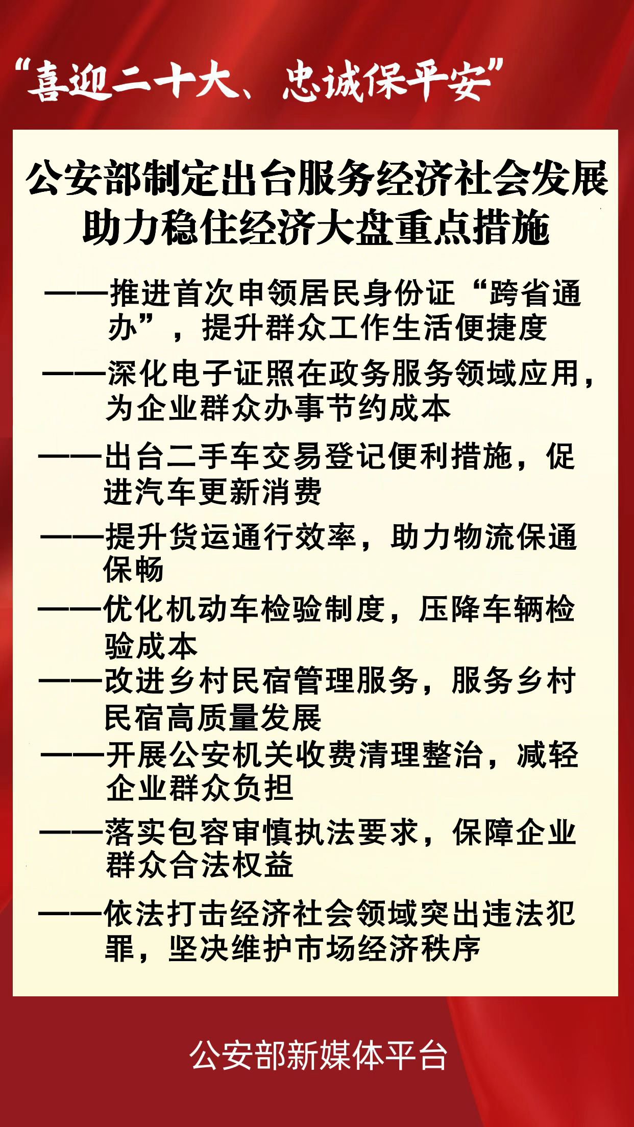 人民網(wǎng)北京8月17日電 (記者郝萍、梁秋坪)記者從公安部了解到,為充分發(fā)揮公安機關(guān)職能優(yōu)勢,更好地服務(wù)經(jīng)濟社會發(fā)展,助力穩(wěn)住經(jīng)濟大盤,公安部日前制定并印發(fā)了2022年服務(wù)經(jīng)濟社會發(fā)展助力穩(wěn)住經(jīng)濟大盤重點措施。