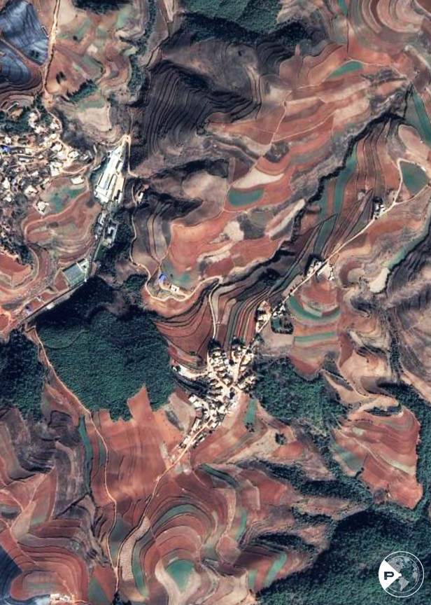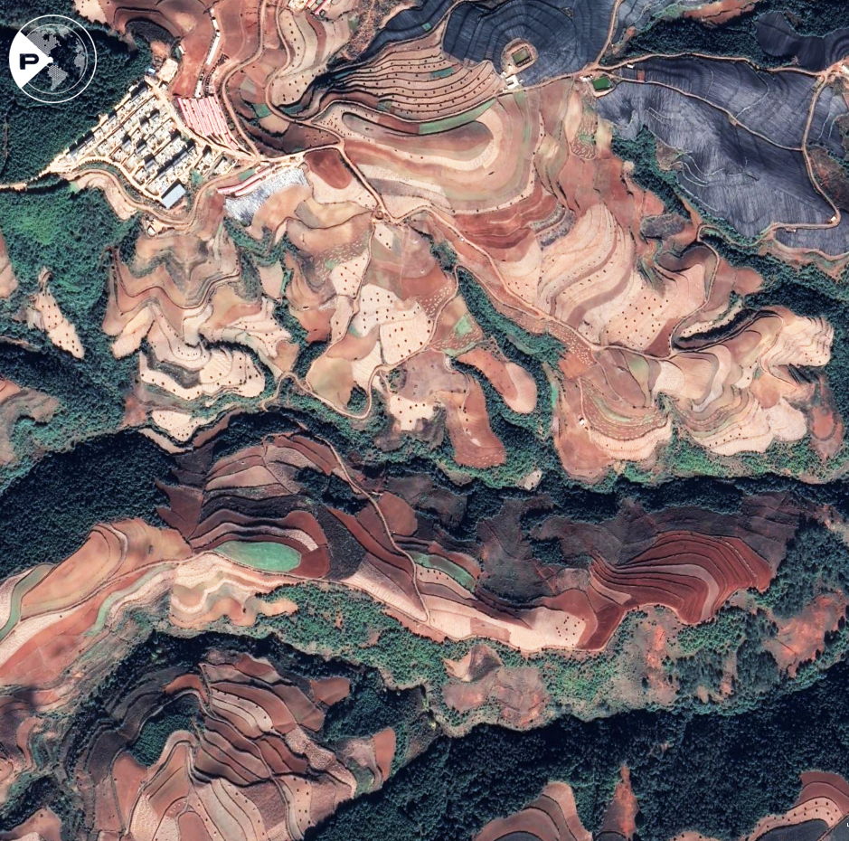 云南昆明東川螺螄田,在云貴大山深處,海拔2000米左右的烏蒙山區(qū)里,有連成片的梯田。由于這里土壤里含鐵、鋁成分較多,就形成了炫目的赤紅色彩。