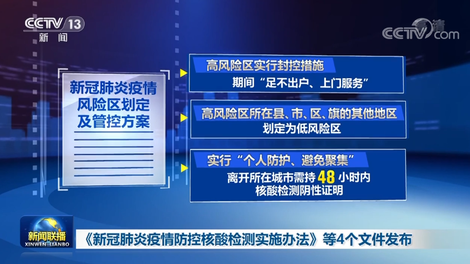 央視網(wǎng)消息(新聞聯(lián)播):國務(wù)院聯(lián)防聯(lián)控機制今天(11月21日)發(fā)布了《新冠肺炎疫情防控核酸檢測實施辦法》等4個防控相關(guān)技術(shù)文件,對核酸檢測、風險區(qū)劃定、居家隔離和健康監(jiān)測等做了進一步規(guī)范。
