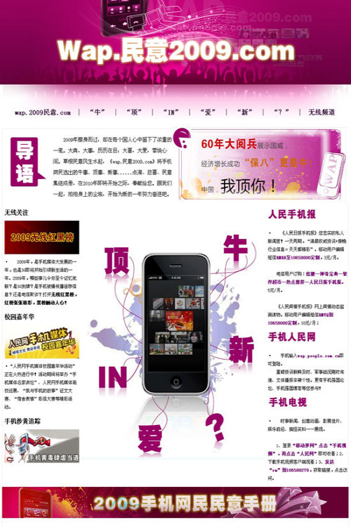 《wap.民意2009.com》手冊集豐富的內(nèi)容、真誠的草根民意、時尚的版面于一身,以2009年網(wǎng)絡(luò)流行語“牛”、“頂”、“IN”等為關(guān)鍵詞,將“國慶閱兵”、“全民攜手防控甲流”、“大學(xué)生英勇救人”等熱點事件“一網(wǎng)打盡”。并將手機網(wǎng)友對此類事件的民意集結(jié)成冊,是第一份屬于億萬手機網(wǎng)民的獨家刊物,也是手機網(wǎng)友回顧2009,展望2010的又一盛宴。