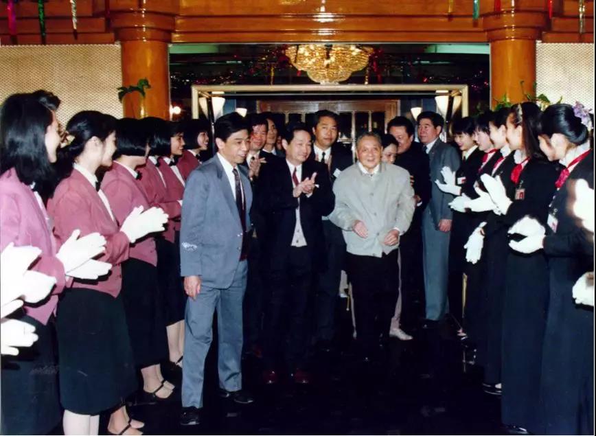 1992年1月,鄧小平同志在深圳國貿(mào)大廈受到員工們的熱烈歡迎。 梁伯權(quán) 攝
