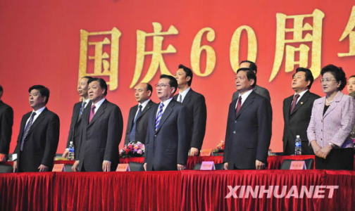 9月25日,“百團萬人頌中華”國慶60周年大型合唱歌詠會在北京“水立方”舉行。中共中央政治局常委李長春出席觀看。這是李長春等與全場群眾一起唱響《歌唱祖國》。新華社記者謝環(huán)馳攝