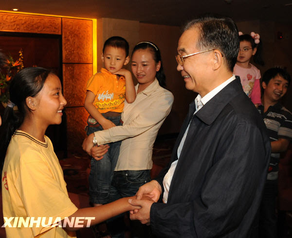 9月25日,中共中央政治局常委、國(guó)務(wù)院總理溫家寶在綿陽(yáng)邀請(qǐng)四川地震災(zāi)區(qū)部分基層干部群眾會(huì)面。這是溫家寶親切地拉著在北川中學(xué)初中一年級(jí)讀書的羌族小女孩劉小樺的手,詢問(wèn)她的學(xué)習(xí)和生活情況。新華社記者黃敬文攝