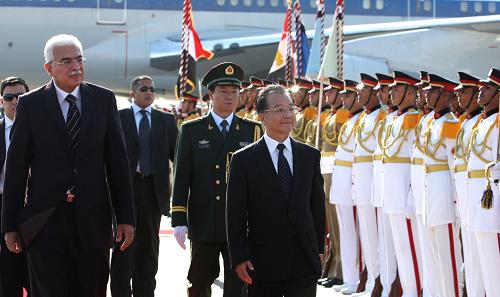 埃及總理納齊夫在舷梯旁迎接溫家寶。機(jī)場(chǎng)上舉行了隆重的歡迎儀式。埃及軍樂(lè)隊(duì)奏中埃兩國(guó)國(guó)歌。溫家寶在納齊夫陪同下檢閱儀仗隊(duì)。中國(guó)駐埃及大使武春華及使館工作人員、華僑華人代表等也到機(jī)場(chǎng)歡迎。溫家寶的主要陪同人員同機(jī)抵達(dá)。