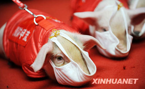 幾只小豬“戴上口罩、穿上馬甲”(11月18日攝)。當(dāng)日,在長沙開幕的2009年中國中部(湖南)國際農(nóng)博會上,一家參展的茶飲料企業(yè)為宣傳預(yù)防甲流知識,讓幾只小豬戴上口罩,穿上防甲流宣傳馬甲,以提醒參觀者養(yǎng)成健康生活習(xí)慣,防止甲流傳播。新華社記者 李尕 攝