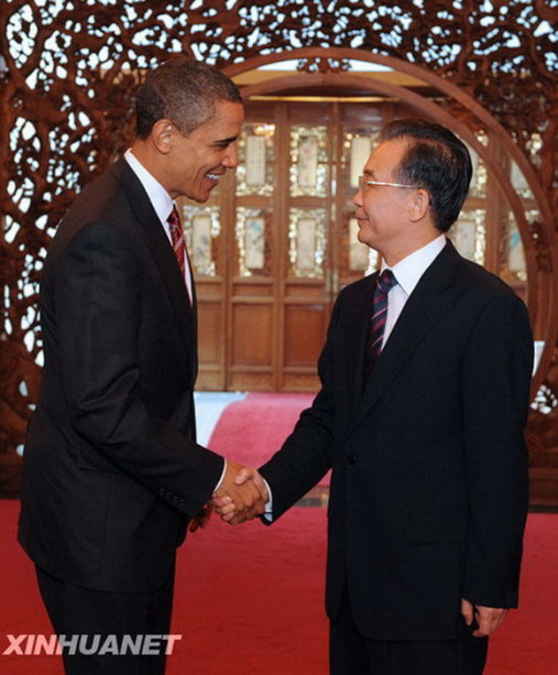 11月18日,中國國務(wù)院總理溫家寶在北京釣魚臺國賓館會見正在中國進(jìn)行國事訪問的美國總統(tǒng)奧巴馬。