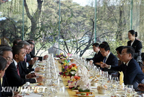 11月18日,中國國務(wù)院總理溫家寶在北京釣魚臺國賓館會見正在中國進(jìn)行國事訪問的美國總統(tǒng)奧巴馬,并為他舉行工作午宴。新華社記者 姚大偉 攝
