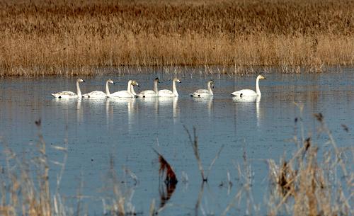 幾只大天鵝游弋在黃河三角洲濕地保護(hù)區(qū)內(nèi)蘆葦蕩中(12月3日攝)。新華社記者 范長國 攝