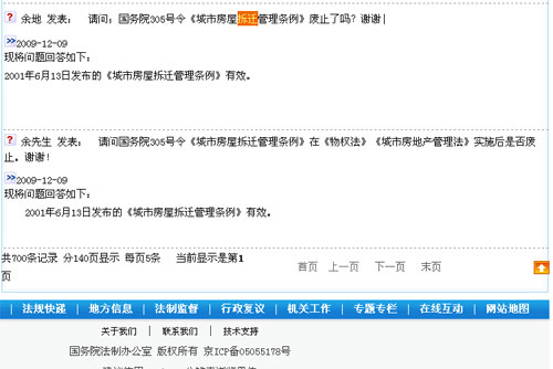 記者日前在瀏覽國務院法制辦網(wǎng)站時發(fā)現(xiàn),在該網(wǎng)站“在線互動”欄目的“留言板”中,回復網(wǎng)民“余先生”“余地”所提的“物權法生效后《拆遷條例》是否廢止”的問題時,稱:“2001年6月13日發(fā)布的《城市房屋拆遷管理條例》有效!