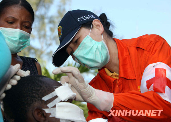 1月17日,一名中國(guó)國(guó)際救援隊(duì)醫(yī)療隊(duì)員在海地太子港為地震受傷人員換藥。當(dāng)日,中國(guó)國(guó)際救援隊(duì)隊(duì)員繼續(xù)在太子港進(jìn)行醫(yī)療服務(wù),他們深入災(zāi)民集中居住區(qū)為受傷人員診治換藥和進(jìn)行衛(wèi)生防疫工作。新華社記者 袁滿 攝