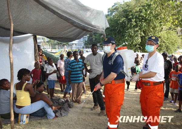 1月17日,中國(guó)國(guó)際救援隊(duì)醫(yī)療隊(duì)員在海地太子港臨時(shí)居住區(qū)內(nèi)噴灑消毒劑。新華社記者 袁滿 攝