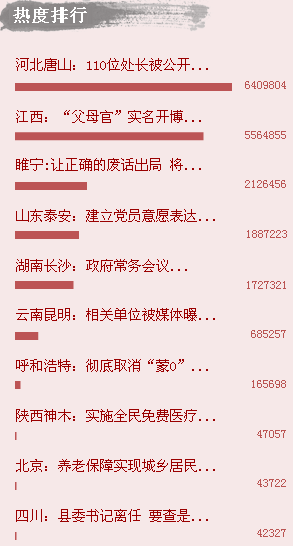 前十名依次為,河北唐山:110位處長被公開“曬權(quán)”接受社會監(jiān)督;江西:“父母官”實名開博 網(wǎng)絡(luò)問政改變官民關(guān)系;江蘇睢寧:讓正確的廢話出局 “曬”年度“最差領(lǐng)導(dǎo)講話”;山東泰安:建立黨員意愿表達制 公推直選黨員說了算;湖南長沙:政府常務(wù)會議“全媒體”直播;云南昆明:相關(guān)單位被媒體曝光十日不反饋要問責;內(nèi)蒙古呼和浩特:徹底取消“蒙0”特權(quán)車牌號;陜西神木:實施全民免費醫(yī)療 每年報銷上限為30萬元;北京:城鄉(xiāng)統(tǒng)一的居民養(yǎng)老保險制度正式實施 養(yǎng)老保障城鄉(xiāng)全覆蓋;四川:規(guī)定縣委書記離任 要查是否違規(guī)用人。